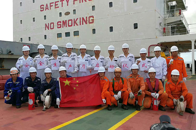 中国华能集团公司瑞宁瑞通公司举办“海上安全月活动启动仪式”, 该船正行驶在太平洋上。