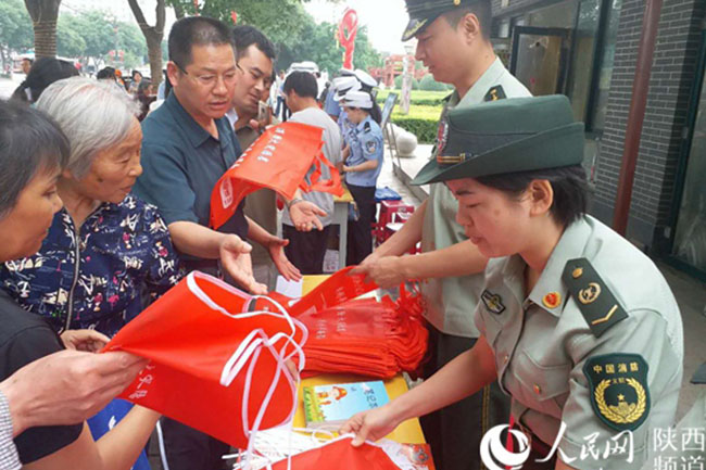 陕西省“安全生产月”启动仪式现场, 向过往群众普及安全常识和自救、互救方法。