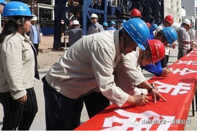 中国大唐集团公司阳城电厂举行“安全生产月”启动仪式, 公司员工在印有活动主题的横幅上签名。