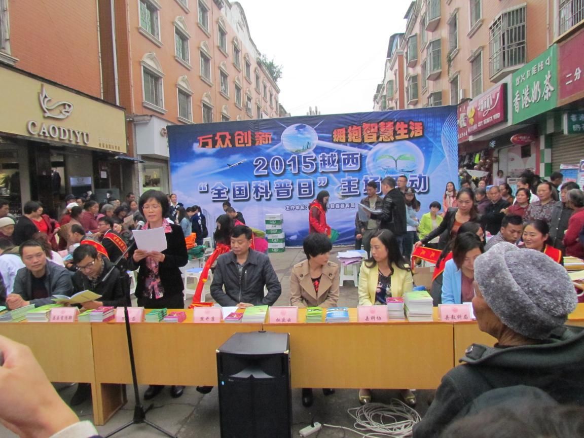 为进一步增强全民防震减灾意识,9月21日上午,由中共越西县委宣传部、县科协、县防震减灾局主办的以“万众创新 拥抱智慧生活”为主题的2015越西“全国科普日”科普宣传活动在县城步行街举行。县人大副主任熊开康、县政府副县长陈玉蓉、县政协副主席杜庆云和全县29个单位、科普志愿者近百人参加了主场活动。县人大副主任熊开康主持了主场活动,县政府副县长陈玉蓉为主场活动致辞。活动现场开展了科普知识宣传资料发放、现场咨询、健康免费义诊等活动,共发放《大凉山特色农产品实用技术》、《科普宣传手册》、《科学种植猕猴桃》、《食品药品安全手册》、《禁毒防艾宣传读本》、《越西县农村民居抗震设防施工指南》、《普法宣传》、《低碳宣传单》、《地质灾害防御》、《气象灾害防御指南》、《生命在这里延续》等90余种科普宣传资料23800余份(册),活动受益群众达6000多人,活动得到了广大群众的热烈欢迎。